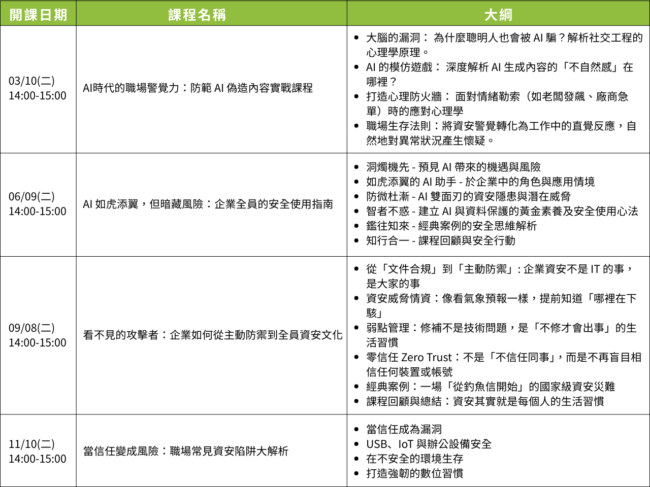 本系列課程以通俗易懂的方式呈現,並融入實務案例設計,協助企業員工對AI深偽(deepfake)內容的辨識警覺力,安全使用AI的實用指南,建立員工的資安意識,全面建構企業資安防護力,歡迎國內企業及各機關團體踴躍報名。