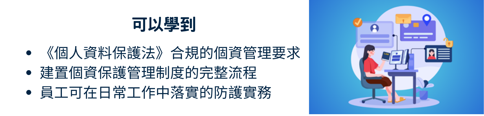 深入介紹台灣個人資料保護法的核心要求與何規重點,並結合實際案例剖析,提升員工對個人資料洩漏風險的辨識能力。課程內容涵蓋法律架構解讀、典型洩漏事件分析、企業內部管理制度建置,以及日常保護實務與行為準則,協助學員全面理解個資安全防護的必要性與實踐方法。